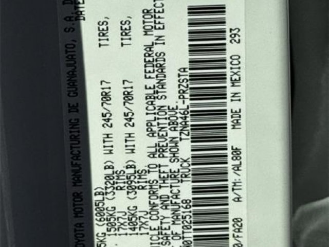 Fabric Seat Trim|Spray-on Bed Liner|3.583 Axle Ratio|Radio: 8"" Toyota Audio Multimedia|Wheels: 17"" Styled Alloy|4-Wheel Disc Brakes|Emergency communication system: Safety Connect (up to 10-year trial subscription)|Apple CarPlay/Android Auto|Auto High-beam Headlights|Exterior Parking Camera Rear|AM/FM radio: SiriusXM|Front beverage holders|Variably intermittent wipers|Trip computer|Traction control|Tilt steering wheel|Telescoping steering wheel|Steering wheel mounted audio controls|Split folding rear seat|Speed-sensing steering|Speed control|Remote keyless entry|Rear window defroster|Rear step bumper|Power windows|Power steering|Power door mirrors|Passenger door bin|Overhead console|Overhead airbag|Outside temperature display|Occupant sensing airbag|Low tire pressure warning|Knee airbag|Illuminated entry|Heated door mirrors|Fully automatic headlights|Front wheel independent suspension|Front reading lights|Front anti-roll bar|Dual front side impact airbags|Dual front impact airbags|Driver door bin|Bumpers: body-color|Brake assist|Anti-whiplash front head restraints|Alloy wheels|ABS brakes|Tachometer|Front Center Armrest|Front Bucket Seats|Electronic Stability Control|Air Conditioning|6 Speakers